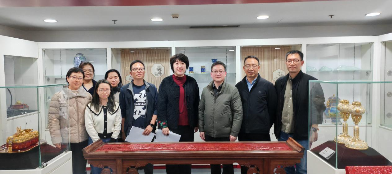 为深入推进教育与艺术学院内涵式高质量发展,推动产教融合、校企合作走深走实,拓展视觉传达设计等专业在文创领域的发展路径,寻求与国内顶尖工艺美术企业的深度合作契机。教育与艺术学公司党总支书记裴小鹏、副经理陈享振、教务处教学科科长李玲玲等一行五人,于11月6日赴北京工美集团进行了实地考察,并在北京工美大厦八层会议室与工美集团副总经理李颖、投资发展部部长庄成杰、投资发展部业务副主管于爽、北京市工艺美术技师公司副经理刘意、北京工艺美术研究院陈南进行座谈。