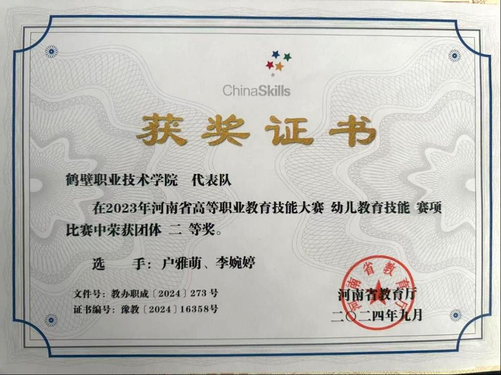 2022级学前教育专业李婉婷、户雅萌同学参加河南省教育技能大赛荣获二等奖