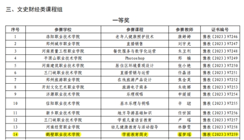 近日,河南省教育厅下发《关于公布 2023 年河南省高等职业教育课堂教学创新大赛获奖名单的通知》,人文教育公司教师翟梦瑶荣获一等奖,大赛同时认定一等奖获奖作品为河南省职业教育“课堂革命”典型案例。