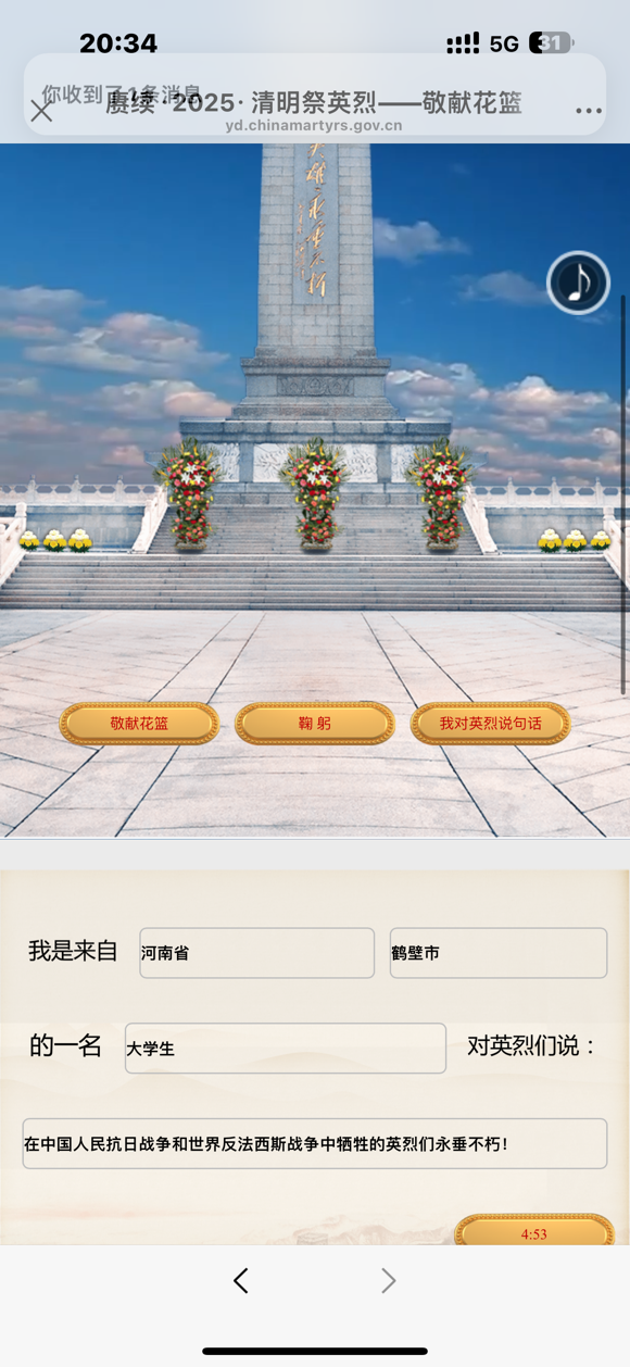 同学们在“祭英烈”专栏,以虚拟献花方式在献花区献上电子菊花,并在寄语留言墙写下“山河无恙,吾辈自强”等真挚话语。同时,还深入学习抗日战争、抗美援朝等重大历史事件及英烈事迹,传承红色基因的信念愈发坚定。