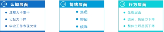 失眠的主要表现有:①入睡困难,即卧床30分钟内无法入睡;②睡眠维持困难,即入睡后频繁醒来,醒后入睡困难;③睡眠质量下降:睡眠浅、多梦;④日间残留效应:次日感到头昏、精神不振、嗜睡、乏力等。失眠在认知、情绪、行为三个层面对我们的影响。(见图一)因此,我们应重视失眠问题。