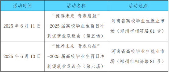 6月4日(本周三)、6月6日(本周五),河南省高校毕业生就业市场将举办“豫荐未来 青春启航”——2025届河南省高校毕业生百日冲刺促就业双选会(第三场)和第四场,欢迎2025届毕业生和往届未就业毕业生参加!